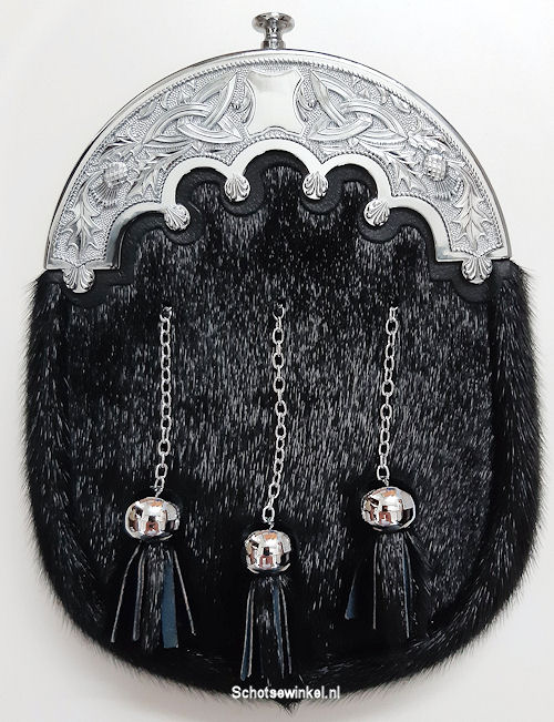 A beautiful 3 tassel, black sporran mounted with a Celtic teardrop designed cantle.